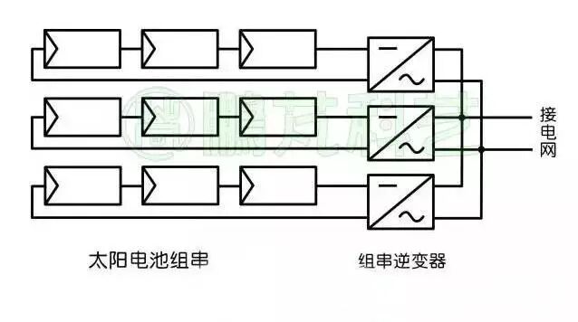 单块太阳电池组件工作电压一般为十几伏到四十几伏,输出电流也有限,把一定数量的太阳电池组件串联成太阳电池组件串(简称组串),再根据现场条件和太阳电池方阵输出的电流、电压、功率和并网需求对太阳电池组件串与逆变器进行连接。连接方式多种多样,归纳起来主要有3种连接方式。