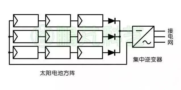 将多个规格相同的太阳电池组件串并联后再接入逆变器的直流输入侧,通过逆变器输出交流电并入单相或三相电网。由于只有一个逆变器,系统成本较低;但各太阳电池组串的输出会有差别,特别是各太阳电池组件串光照不同时,许多太阳电池组串不是工作在最佳工作点附近,转换效率较低。这种系统主要应用在大规模的沙漠光伏电站。图3是集中逆变器连接示意图。