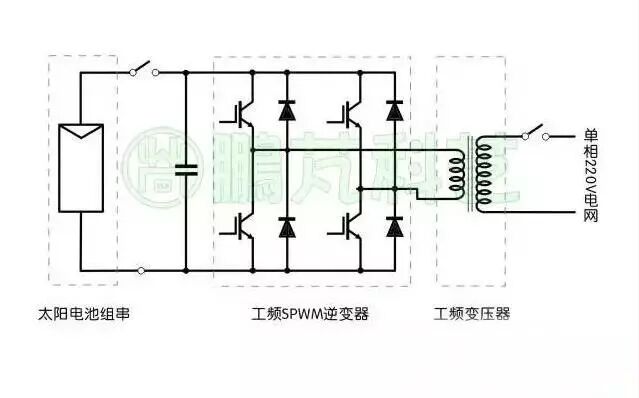 将光伏阵列的直流输出逆变为交流电后,通过工频变压器实现并网。工频变压器的体积与重量大,现在已较少应用。图6是工频变压器隔离的逆变器示意图。