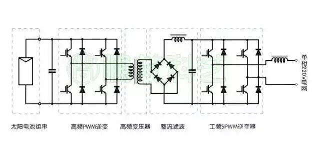 高频变压器隔离方式主电路由太阳电池阵列直流输入,经过高频逆变器转换成高频交流电压,经高频变压器提升电压后,再经高频整流电路转换成直流电,最终经过工频逆变器输出工频交流电。高频PWM方波频率达20kHz以上,故高频变压器体积小重量轻,整流后的滤波电容也小很多,可使装置小型化、集成化。但与工频变压器隔离相比,电路构成、控制方式均比较复杂,由于经过两级转换,系统的效率也有所下降。